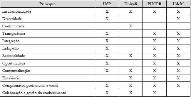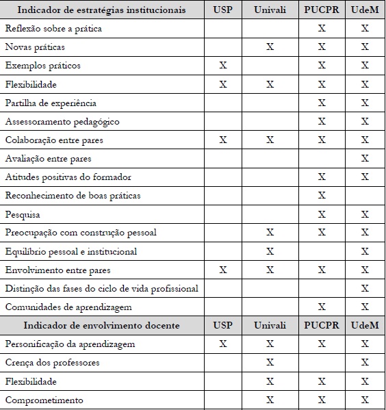 No Quadro 6, encontram-se assinalados os princípios que podem ser inferidos como presentes na proposta das instituições a partir da documentação analisada, apoiadas por Marcelo Garcia (2006 apudMAYOR RUIZ, 2009). As lacunas maiores nessas universidades são relativas à diversidade de recursos oferecidos para a formação e à garantia de continuidade dos centros de formação. Pelo site, observa-se que a USP e a UdeM oferecem diferentes alternativas para formação, algumas de autoformação, como vídeos e referências diversas, como também estratégias de atendimento diferenciadas para professores novatos ou experientes. Quanto à continuidade dos centros de formação, esse pode ser um desafio tanto para universidades nacionais quanto internacionais. A descontinuidade é evidenciada ao encontrar, nos sites, páginas desatualizadas ou boletins e jornais virtuais que não foram atualizados ao longo dos anos.