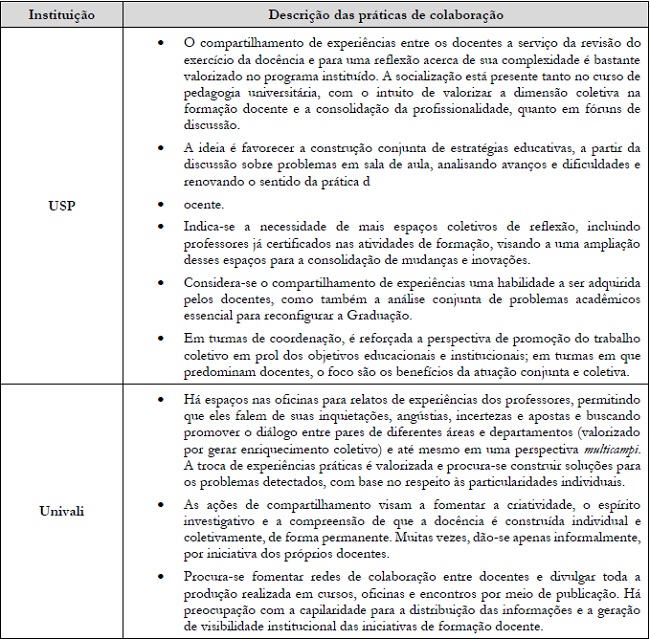 A socialização de experiências, aspecto mais presente nos casos estudados, revelado intrinsecamente nas iniciativas de formação, como cursos e oficinas, evidencia que há muito a ser explorado em relação à colaboração entre pares nas instituições de Ensino Superior preocupadas em investir em desenvolvimento profissional docente, especialmente no sentido de que o compartilhamento de experiências, embora fundamental para romper o isolamento, não constitui iniciativa que promove projetos coletivos, em direção a um objetivo comum.