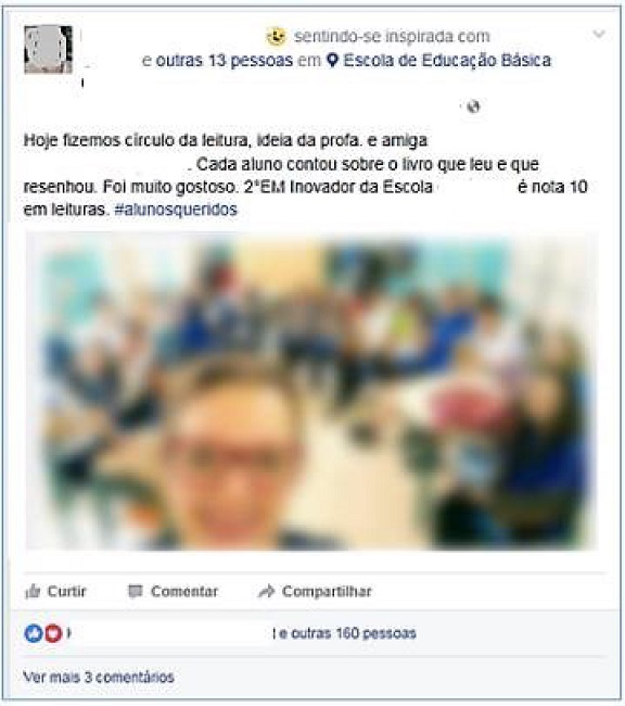 Por outro lado, todo texto materializa uma discursividade, ou seja, significa o lugar de quem e onde escreve e para que(m) escreve. É acerca dessas relações que queremos discutir, pois, como a professora autora da postagem, é fato que existem outros docentes que escrevem em redes sociais, como o Facebook. Ao observar suas postagens, como a que destacamos, podemos notar que usualmente citam outros colegas ("Hoje fizemos...ideia da profa e amiga...) e têm leitores que "curtem, compartilham e comentam” seus textos. Diante disso, perguntamo-nos: Que importância os professores atribuem à divulgação de suas ideias/práticas educativas nesse espaço informal? Quem são os leitores dessas postagens? Que vivências ou experiências dão significado à atitude em escrever sobre suas práticas educativas na rede social? E, especialmente, em quais aspectos ser facebookeir@ contribui para o seu desenvolvimento profissional docente?