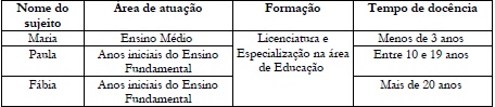 Diante do Quadro 1, denotamos que todas as professoras possuem Graduação e Especialização na área de Educação. São docentes na Educação Básica, apesar de atuarem em etapas diferentes. Elas possuem tempo de carreira distintos, sendo Maria principiante, Paula e Fábia peritas na docência. Podemos inferir que os sujeitos têm experiências de desenvolvimento profissional docente atreladas aos espaços de educação formal - para sua formação inicial e continuada e para a prática profissional.