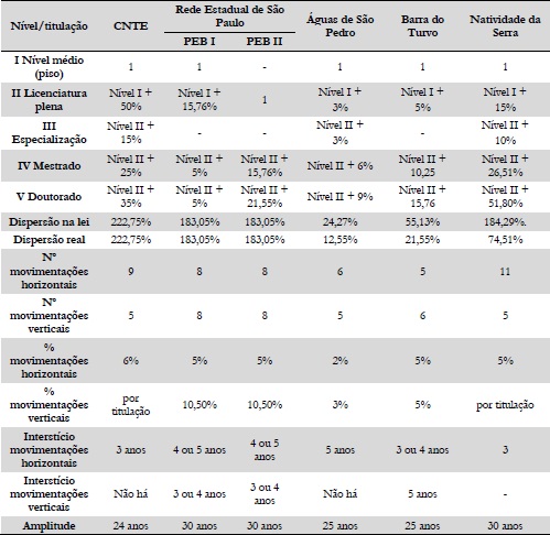 As estruturas das carreiras de Águas de São Pedro, Natividade da Serra e Barra do Turvo (como também da Rede Estadual de São Paulo) apresentam em comum uma tabela salarial de duas entradas (possibilitando a movimentação vertical e horizontal), dando-se uma das movimentações pela apresentação de títulos e a outra, pela avaliação de desempenho e/ou tempo de serviço. Nos três municípios, a movimentação que levaria em conta a avaliação de desempenho e/ou tempo de serviço não foi regulamentada, o que significa que, em termos reais, essas carreiras apresentam apenas a progressão pela apresentação de títulos.