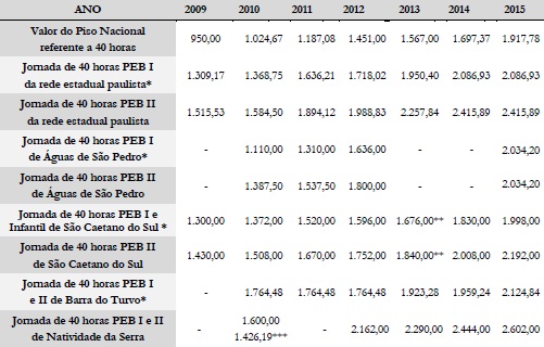 É interessante observar que os municípios de Barra do Turvo e Natividade da Serra, com os menores IDHM em Educação do Pnud (2010) de São Paulo (respectivamente 0,532 e 0,520) e com os menores rendimentos de PIB per capita dos municípios do estado (classificados respectivamente na posição de 632 e 641), apresentam vencimentos iniciais na carreira superiores aos municípios de São Caetano do Sul e Águas de São Pedro (classificados respectivamente na posição de 11 e 177 de maior PIB per capita dos municípios paulistas), e que têm os maiores IDHM em Educação do Pnud do estado (respectivamente 0,811 e 0,825), conforme Tabela 2.