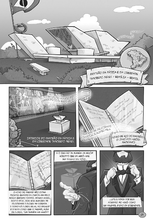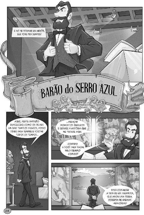 Organizada e editada pelo Núcleo de Mídia e Conhecimento e com uma revisão histórica realizada pelo Instituto Histórico e Geográfico do Paraná (IHGPR), a história em quadrinhos foi planejada com claro intuito educativo e memorial. Nesse sentido, os produtores foram bastante detalhistas ao reproduzir diversas fontes históricas como mapas de época, documentos, capas de jornais e selos da erva-mate. Como o próprio título sugere, o fio narrativo da história desenvolve-se por meio de um grande nome, o herói Ildefonso Pereira Correia, Barão do Serro Azul, muito embora não se atenha apenas à sua biografia. Para melhor visualizarmos o caráter histórico, político e biográfico dessa narrativa, reproduziremos as duas primeiras páginas da mídia que apresentam ao leitor a personagem histórica tratada (Figuras 1 e 2), já heroicizada pela constatação de ser o único paranaense incluído no Panteão da Pátria e da Liberdade Tancredo Neves2.