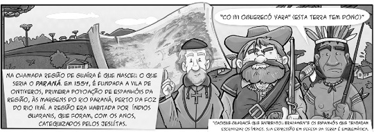 O trabalho com a HQ, portanto, não se detêm no que está contido nela, por vezes justamente o que foi omitido é o que pode ser aprofundado. Podemos propor aos estudantes mais jovens um exercício de redesenhar tais personagens, incluindo aqueles ausentes pelo escopo do quadrinho impresso, revisado pelo Instituto Histórico e Geográfico Paranaense (IHGPR) e distribuído às escolas públicas municipais.
