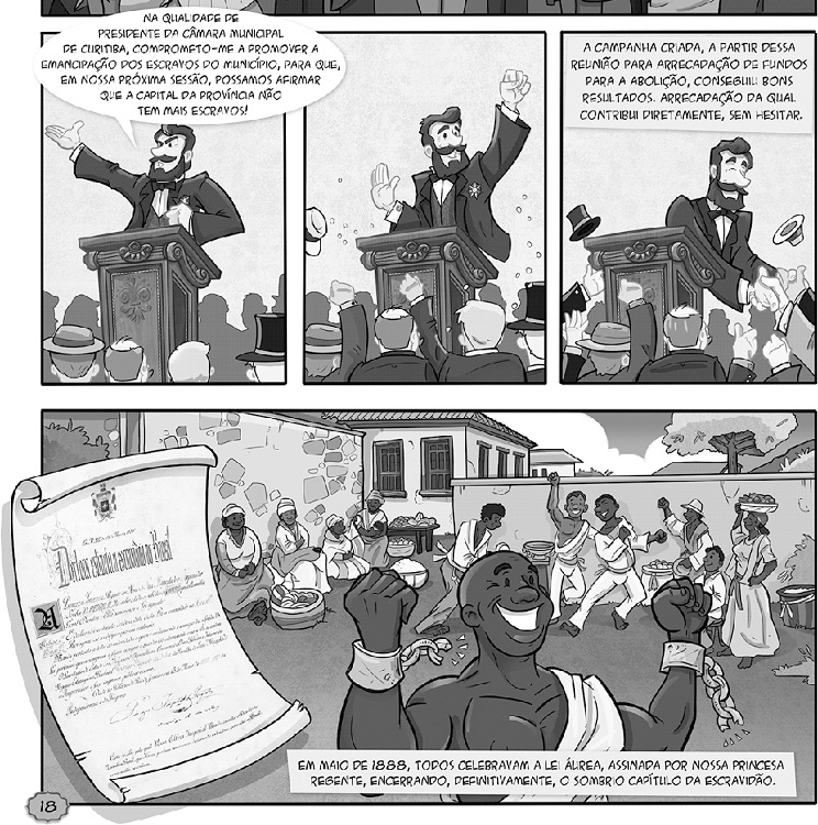 Constantemente ressaltando valores morais, familiares e cidadãos, a história do Barão descreve a biografia do Barão em paralelo à história do Paraná, ressaltando o caráter histórico-didático da obra. No quadrinho anteriormente apresentado, remonta-se às pretensas raízes de formação do estado, sendo empregada, em diversos trechos, a palavra "evolução" para tratar das mudanças históricas, em uma articulação entre as ideias de "civilização" e "progresso", compondo, assim, uma percepção bastante empobrecida e conservadora da forma de perceber as dinâmicas histórias. Tal constatação pode ser evidenciada em uma passagem que se refere ao movimento abolicionista e à assinatura da Lei Áurea. Para tanto, desenham-se cinco quadrinhos e apenas no último aparecem os escravos (Figura 4). Um homem em maior destaque desenhado à frente dos demais tem, em seus pulsos, algemas com as correntes arrebentadas, em uma imagem simbólica pretensamente impactante e alegre. Ao fundo, representam-se sorridentes homens e mulheres negros, sendo as últimas apresentadas próximas a cestas de comidas, em uma articulação simbólica entre feminilidade e alimentação. A frase narrativa desse quadrinho é: "Em maio de 1888, todos celebravam a lei Áurea, assinada por nossa princesa regente, encerrando, definitivamente, o sombrio capítulo da escravidão."