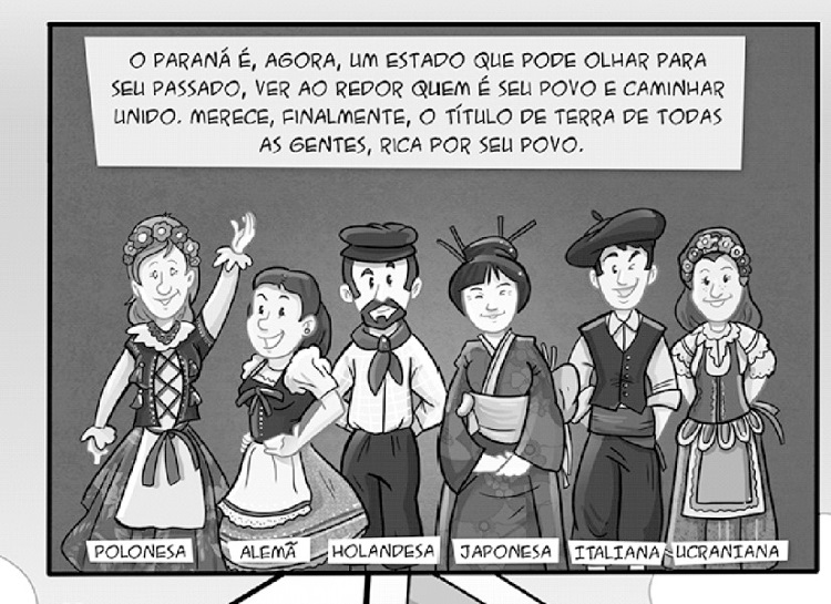 Também sugerimos que o professor aborde a história indígena, apresentando fotografias das etnias Kaingang, Xetá e Guarani e suas produções (esculturas, instrumentos, tecelagem e adornos), mostrando como a terra hoje chamada Paraná não era um grande campo desabitado esperando a intervenção dos europeus para se desenvolver, mas abrigava povos culturalmente diversos. Sob essa mesma perspectiva, ressaltar que esses povos não desapareceram, embora em quantidade brutalmente diminuída existem indígenas e reservas no estado do Paraná. Pode-se mencionar, também, povos extintos antes mesmo da chegada dos europeus, como o caso dos sambaquieiros. Nesse sentido, o professor tem a oportunidade de apresentar dissonâncias com relação à narrativa do quadrinho que, sob o discurso da pluralidade de povos (Figura 5), sustenta o tradicional preconceito do Paraná como uma terra de pessoas brancas, a Europa do sul.