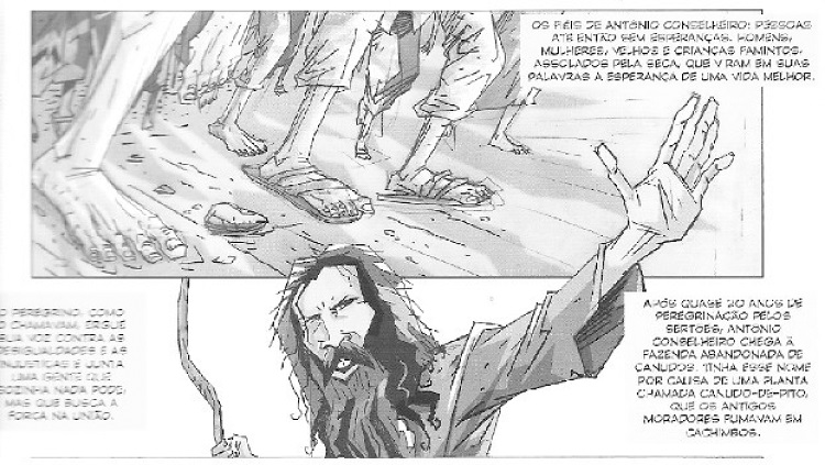 De todas as formas, a personagem figura de maneira exaltada pela narrativa, ainda que demonstre o protagonismo popular. Sendo considerado um peregrino que resgatou "[...] pessoas até então sem esperanças. Homens, mulheres, velhos e crianças famintos", ele "[...] ergue sua voz contra as desigualdades e injustiças" (DINIZ; AGUIAR, 2008, p. 9) da sociedade. Além disso, ao analisarmos graficamente o recorte da HQ, é plausível mencionar a configuração de uma moldura heroica de Antônio Conselheiro: o braço esticado é representado no primeiro plano, como saindo da superfície da página, de mão aberta, parecendo conceder uma bênção ao povo e seus seguidores. Pode-se questionar se essa representação é suficiente para conceder o papel de herói ao personagem? Na narrativa, Antônio Conselheiro é de fato definido como um herói, um personagem que salva da miséria o povo e consegue resgatar a esperança de seus seguidores. Inclusive mantém o caráter conservador de herói, visto que o Conselheiro seria um monarquista em sua concepção política, haja vista o trecho no qual o peregrino desdenha a falar mal da República: