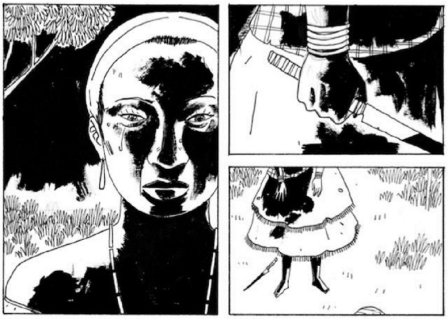 Uma das transformações fundamentais dentro da historiografia sobre escravidão no Brasil faz referência à composição epistemológica das análises. De cativos subjugados e quase sem possibilidades de resistência frente a um sistema escravista austero, os escravizados passam a ocupar uma posição de sujeitos participantes do processo histórico, em interação de conflito e dinamismo com as estruturas sociais. Trata-se de um decurso no qual "[...] há esforços em destacar as vivências, os significados, as estratégias e a lógica das ações de mulheres e homens escravizados no cotidiano, como também se destacam as diversas formas de resistência escrava, que vão além do conflito direto com o sistema" (ROCHA, 2009, p. 25-26). Essa essência permeia a construção da narrativa de Cumbe. A composição da HQ busca evidenciar em cada história as resistências cotidianas de escravizados, abordando estratégias utilizadas por eles, como fugas individuais, motins organizados por grupos e até mesmo assassinatos de senhores promovidos pelos negros. Todo em preto e branco, o quadrinho é rico em elementos gráficos que expressam as inúmeras emoções dos agentes históricos em questão, afastando-se da maneira impessoal de apresentação dos sujeitos, notadamente das abordagens que relegam aos sentimentos e às vivências dos escravizados uma posição marcadamente secundária em detrimento da valorização das dinâmicas econômicas e estruturais. Ao contrário de meros números estatísticos, as personagens retratadas pelo quadrinho sentem, amam, choram e sonham (Figura 7). O desfecho de uma das histórias é inequívoco em relação a isso, pois tem como mote o assassinato de um senhor de engenho perpetrado por uma escrava após sua filha ter sido morta pelo mesmo senhor.