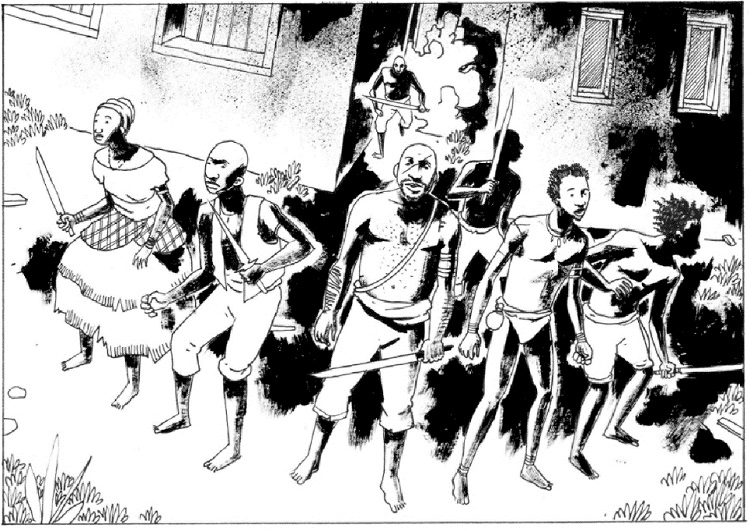 Nesse sentido, a resistência e a subversão do arranjo social tal como é forjado são representadas em sua dimensão coletiva, como se a substância heroica presente em um superindivíduo se encontrasse difusa entre muitos escravizados. É importante que se aponte, contudo, que o coletivo em Cumbe não se apresenta como uma massa indiferenciada, um grupo movido por objetivos exatamente iguais, com o mesmo ímpeto e coragem. Há a preocupação em detalhar os agentes dessas resistências cotidianas, explorar as profundidades e as contradições dos personagens, legando contornos mais nítidos ao sujeito histórico. Mesmo quando aborda um levante em grupo (Figura 8), D'Salete tem a preocupação de delinear as individualidades dos escravizados, inclusive a partir de conflitos e de tensões entre eles próprios. Em uma das passagens, alguns escravizados organizam-se em rebelião, juntando facas e adagas para o combate. Mesmo nos quadrinhos em que o grupo é retratado, o leitor não deixa de perceber as diferenças entre cada escravizado, uma vez que suas trajetórias são trabalhadas em páginas anteriores. Trata-se de um retrato que assume a relação dialética entre indivíduo e coletivo, a individualidade que se diferencia de um todo homogêneo, mas que é, em alguma medida, informada e influenciada pelo caráter coletivo.