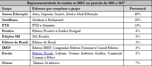 Criam-se, assim, as condições para emergência e expansão de grupos editoriais que mantêm o oligopólio das vendas de livros didáticos no Brasil, em um movimento que não é disjunto daquele que promoveu o fechamento e/ou incorporação de algumas editoras por grupos maiores. Não falamos apenas de pequenas editoras familiares, mas também de empresas já consolidadas no mercado, incorporadas principalmente por grupos de capital estrangeiro, dando origem aos três grandes grupos editoriais dominantes no mercado editorial brasileiro na atualidade: Somos Educação, Santilhana e FTD, que juntos detêm 78% das vendas ao MEC no período de 2005-2017 conforme indica o Quadro 2.