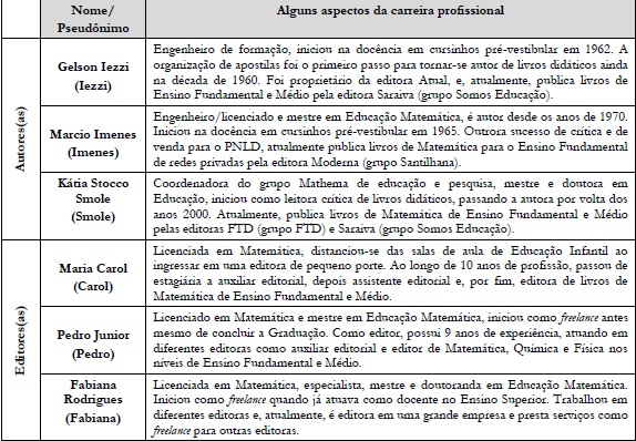 Dessa forma, embora tivéssemos previsto alguns passos iniciais, como entrevistar autores com mais tempo no mercado de didáticos ou com um número considerável de aprovações no PNLD, a dinâmica do caminho nos impulsionava a outros lugares: uma entrevista nos levava a outra, uma temática despertava novo interesse, dando origem a uma pesquisa que se construiu no processo. Nesse percurso, alguns critérios foram construídos, como a busca por selecionar apenas colaboradores que atuaram/atuam em um dos três grandes grupos editoriais citados anteriormente (FTD, Santilhana, Somos Educação). O critério para a escolha dos avaliadores levou em conta a importância do cargo e/ou tempo que exerciam a função.