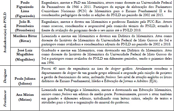 Embora cada diálogo tenha, de alguma maneira, influenciado nossa compreensão sobre a constituição do livro didático, apresentamos, no Quadro 3, os dados dos participantes citados neste artigo. Dentre os entrevistados, apenas autores e avaliadores terão seus nomes relevados, já que concordaram com a divulgação, atestada pela assinatura de um termo de cessão; os demais terão preservada sua identidade pelo uso de um pseudônimo.