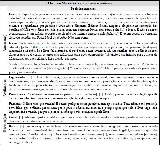 Entendemos que os valores negociados entre o MEC e as editoras em cada PNLD oferecem uma razoável compreensão de sua importância como ativo econômico. Todavia, não buscamos apenas evidenciar o modo como o livro didático passou a ocupar tal status, mas descrever como os personagens que atuam nesse campo compreendem as relações entre o didático e o financeiro, bem como o modo como essas compreensões se evidenciam em práticas discursivas e toda sorte de tecnologias mobilizadas em um processo que coloca o livro didático de Matemática em uma fronteira (sem limites definidos) entre o campo educacional e econômico. Para compreender essa dinâmica e complexa relação mais de perto, consideramos, no Quadro 4, o posicionamento de alguns personagens que compõem essa produção: