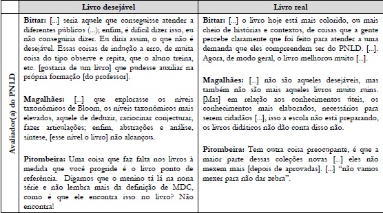 Consideramos, no caso dos avaliadores, a ausência de um posicionamento uniforme, alternando posições em um terreno discursivo em que, de um lado, se alinham a um discurso oficial de satisfação com os livros atuais, visto alguns avanços obtidos em relação aos livros anteriores ao PNLD; enquanto, por outro, ressaltam as dificuldades para superar a estagnação das obras após sua aprovação.