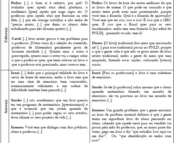 Note que os recortes anteriores trazem posicionamentos muito semelhantes, ainda que sejam diferentes os personagens, sua formação e áreas de atuação. Bastaríamos trocar a palavra "livro" por "produto", "editora" por "empresa", e não teríamos a mínima ideia de que o diálogo envolve livros didáticos de Matemática. Assim, o livro transformou-se em um produto comercial, e sua comercialização visa, antes de tudo, o lucro, sendo os parâmetros voltados ao ensino e de aprendizagem da Matemática colocados em segundo plano, em detrimento do desenvolvimento de um produto mais adequado ao mercado.