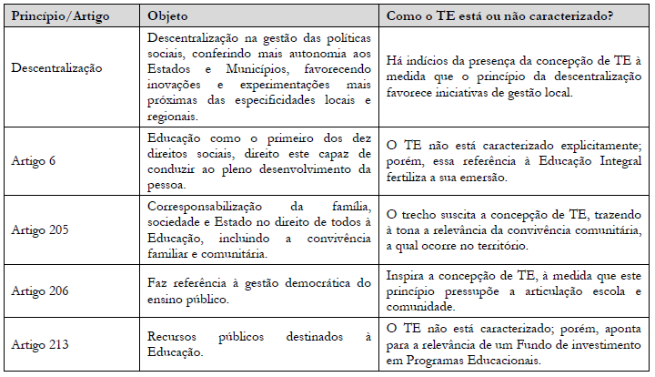 Conforme podemos observar, o princípio da descentralização político-administrativa abre campo para novas experimentações em âmbito local e regional, evidenciando a força da localidade para o desenvolvimento de propostas educacionais ou sociais. Podemos entender que, mesmo quando a concepção de Território Educativo não está caracterizada, já emergem elementos que constroem um contexto de implementação de ações em Educação no território, como os Fundos de Investimento, ou as referências ao desenvolvimento de ações em Educação Integral, a doutrina de Proteção Integral destinada às crianças e adolescentes e à articulação escola-comunidade.