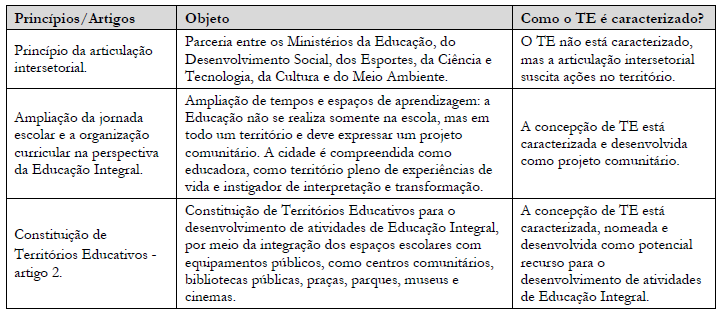 Quando há indícios da caracterização de Território Educativo, ou seja, essa concepção ainda não aparece nomeada, já identificamos nos textos e marcos legais a referência da composição de parcerias entre escola e outros equipamentos, articulação intersetorial e na ampliação da jornada para tempo integral.