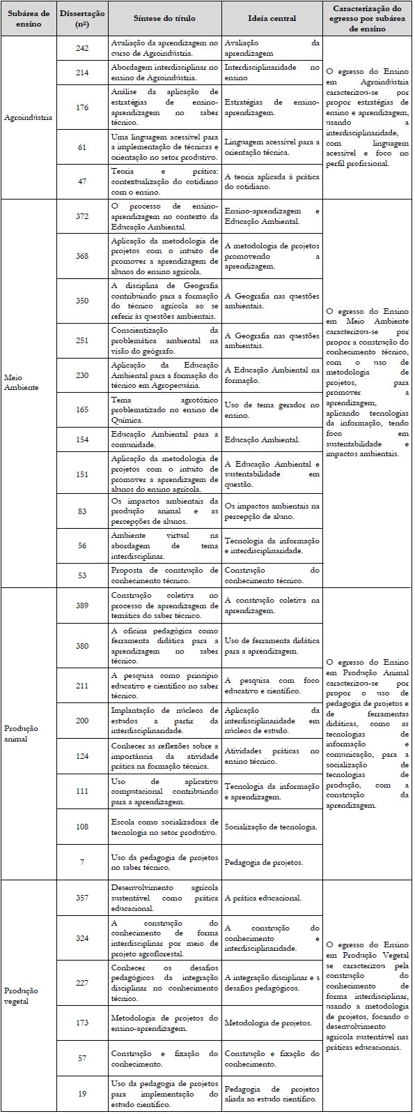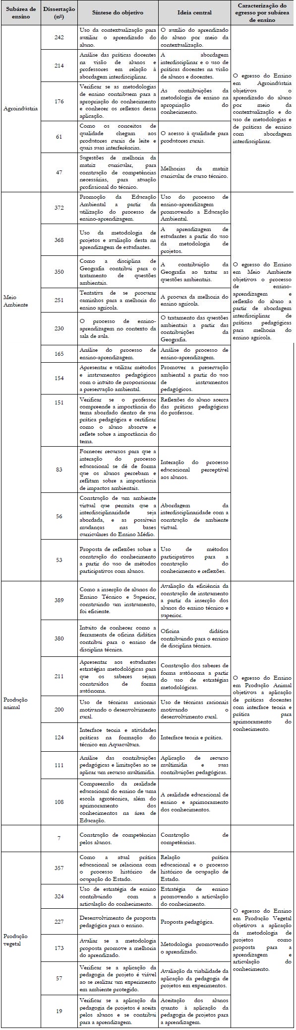 A análise das dissertações envolveu os títulos, os objetivos, os sujeitos da pesquisa e os resultados, sendo esses conteúdos demonstrados por intermédio das sínteses e das ideias centrais de cada um. Assim, procedeu-se à composição em ordem alfabética das áreas de Ensino: em Agroindústria, em Meio Ambiente, em Produção Animal e em Produção Vegetal, que foram disponibilizadas em quadros.