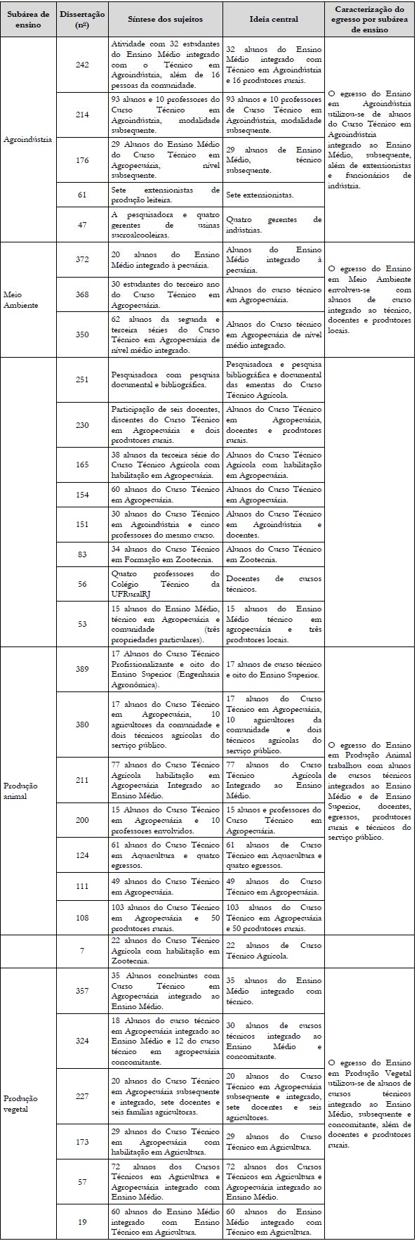 Continuando, elaboraram-se a síntese e a ideia central do indicador sujeitos participantes, os quais estiveram presentes nas dissertações estudadas (Quadro 3). Na subárea de Ensino em Agroindústria, os sujeitos envolvidos foram os alunos do Curso Técnico integrado ao Ensino Médio, subsequente, além da participação de extensionistas e de funcionários de indústria. A subárea de Ensino em Meio Ambiente teve, em seu envolvimento, alunos do Curso Técnico integrado ao Ensino Médio, docentes e produtores locais. Já na subárea de Ensino em Produção Animal, os sujeitos foram, além de alunos de Cursos Técnicos integrados ao Ensino Médio, discentes do Ensino Superior, docentes, egressos do Ensino Técnico, produtores rurais e técnicos do serviço público.