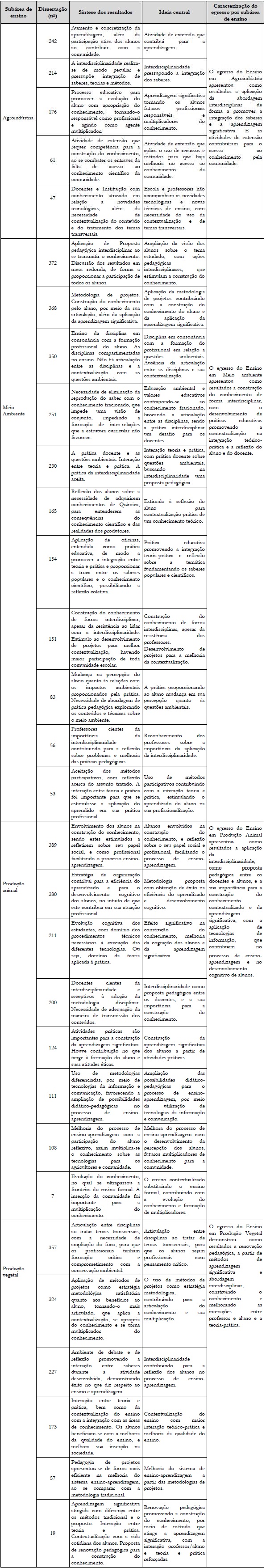 Na subárea de Ensino em Meio Ambiente, fica clara a abordagem da construção do conhecimento de forma interdisciplinar, com desenvolvimento de práticas educativas de forma a promover a contextualização na integração teórico-prática e a reflexão do aluno e do docente. Na subárea de Ensino em Produção Animal, aconteceu a aplicação da interdisciplinaridade como proposta pedagógica entre os docentes e os alunos, e a sua importância para a construção do conhecimento contextualizado e da aprendizagem significativa, com a aplicação de tecnologias de informação, que contribuem no processo de ensino-aprendizagem e no desenvolvimento cognitivo de alunos. Já, na subárea de Ensino em Produção Vegetal, os resultados demonstraram que a renovação pedagógica, a partir de métodos de aprendizagem significativa e abordagem interdisciplinar, construiu o conhecimento e melhorou as interações entre professor e aluno e teoria-prática.