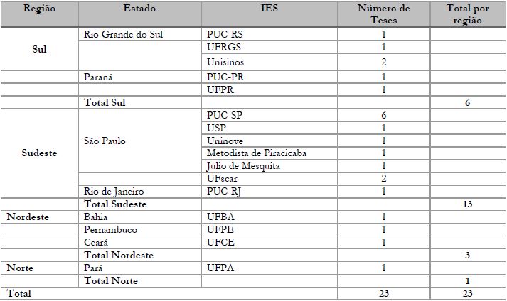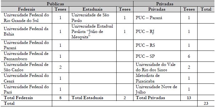 Como se pode observar, 13 das 23 teses foram defendidas em IES privadas (das quais se destacam as universidades católicas - do Rio de Janeiro, São Paulo, Paraná e Rio Grande do Sul), seguidas imediatamente pelas públicas: oito federais, distribuídas pelos estados do Pará, São Paulo, Ceará, Pernambuco, Paraná, Bahia e Rio Grande do Sul, e duas estaduais, todas no Estado de São Paulo. A Tabela 2 apresenta a distribuição das teses por região, estado e IES.