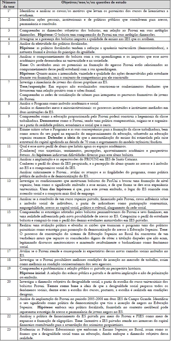 A análise do Quadro 1 elucida a variação na forma com que os diferentes autores enunciam seus propósitos: alguns em forma de objetivos clara e inequivocamente enunciados, outros em forma de tese(s) e/ou hipótese(s) acompanhadas ou não de questões de pesquisa. Com exceção das teses de número 1, 2, 4, 8, 9, 10, 12, 14, 15, 18 e 23, as quais enunciam propósitos descritivo-analíticos, as demais partem de algum tipo de “aposta”; algumas enunciadas claramente como “tese”, outras como hipótese, hipóteses, ou mesmo por meio de verbos como “demonstrar” e “defender”. Os procedimentos para sustentar suas assertivas envolvem, em geral, a análise de documentos combinada com a aplicação de questionários e a realização de entrevistas com bolsistas, egressos, gestores e professores, com exceção das teses de número 5, 9, 10, 16, 19 e 22 que podem ser classificadas como teórico-documentais.