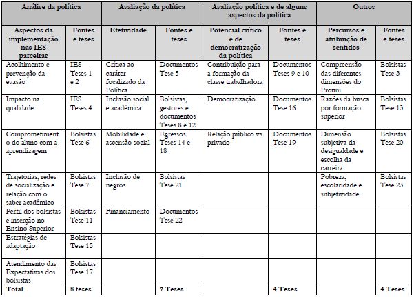 Com base na conceituação exposta, após a identificação da forma como a temática foi explorada nas teses, estas foram categorizadas como estudos de Análise da política, Avaliação da política, Avaliação política e de alguns aspectos da política e Outros, categoria criada para alocar alguns trabalhos que, apesar de terem como informantes bolsistas do Prouni, não chegaram a tratar do programa como objeto principal. Em síntese, o trabalho analítico foi desenvolvido com base em elementos do EEPE, incluindo os tipos de teorização encontrados, abrangendo, também, a análise dos enfoques a partir dos quais os diferentes autores organizaram seus trabalhos e os níveis de abstração neles alcançados.