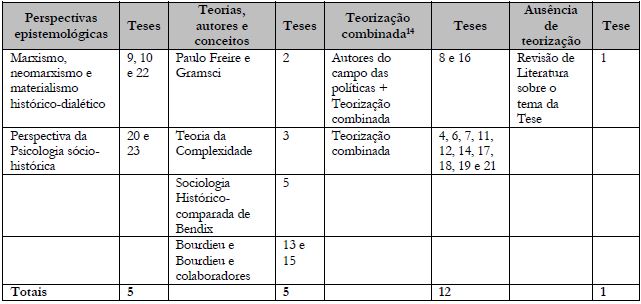 Do ponto de vista do esquema analítico-conceitual geral do EEPE, constata-se, em primeiro lugar, que, considerando a perspectiva epistemológica como as grandes estruturas conceituais a partir das quais o pesquisador constrói a realidade, apenas nas teses 9, 10 e 22, e 20 e 23 constam explicitamente as respectivas perspectivas epistemológicas assumidas: marxista, neomarxista e materialista histórico-dialética, no primeiro caso, e perspectiva da psicologia sócio-histórica, no segundo. As demais formam três subgrupos: (1) o das teses 2, 3, 5, 13 e 15, cujos autores informam referências teóricas, nomeiam autores, conceitos e trabalham fundamentalmente com estes, embora muitos outros autores apareçam citados em diferentes passagens; (2) o das teses 4, 6, 7, 11, 12, 14, 17, 18, 19 e 21, que combinam diferentes autores conceitos e teorias; (3) o das teses 8 e 16, as únicas que, explicitamente, utilizam autores e modelos de análise do campo da política educacional e das políticas públicas, embora também façam uso de teorização combinada. Finalmente, encontra-se também uma tese em que não há teorização.