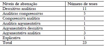 Constatadas a extensão e a estrutura das teses, além do conteúdo dos respectivos capítulos,16 a sistematização dos níveis de abstração foi feita considerando as seguintes possibilidades, combinadas ou não: estudos descritivos, analíticos e compreensivos (MAINARDES; TELLO, 2016) ou, ainda, conforme propõe Dunleavy (2003), combinação dos estilos analítico e argumentativo, argumentativo e analítico e vice-versa. No conjunto, as teses contêm muito de descrição, embora algumas tenham também trabalhado com conceitos e categorias, derivadas das informações obtidas nas IES com bolsistas e outros informantes, ou de alguma teoria em uso, ou mesmo apresentado ideias e ou conclusões originais. Foram identificados estudos mistos, que combinaram descrição e análise, análise e argumentação, capítulos puramente descritivos, além de trabalhos analíticos combinados com tentativas de teorização. A Tabela 3 sintetiza essas informações: