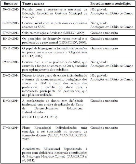 No Quadro 1, sintetiza-se o cronograma de encontros, bem como citam-se os textos, com os respectivos autores, que foram estudados durante as sessões de estudo realizadas. A discussão referente aos últimos textos, voltados à organização e à aplicação do plano educacional individualizado, surgiu, sobretudo, da necessidade, manifestada pela professora coordenadora, de rever a forma de trabalho e o AEE ofertado na SRM, tendo por base as necessidades educacionais específicas dos alunos e a proposta de mediação verbal. Até então, trabalhava-se basicamente com projetos, os quais eram (re)adequados às demandas de cada aluno. Para o acompanhamento individual, as professoras usavam, ainda, fichas descritivas, não padronizadas ou sistematizadas na forma de um plano de ensino individualizado, o qual passou a ser construído por elas.