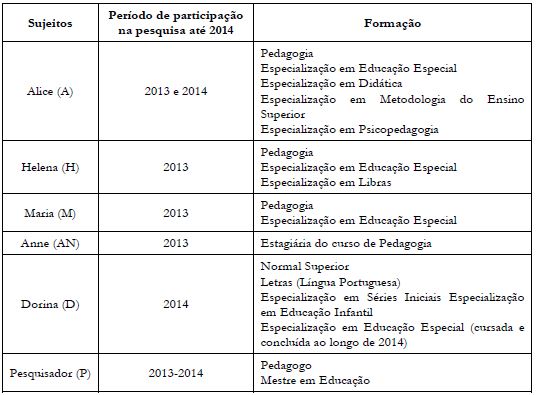 Para garantir seu anonimato, como previsto no TCLE, as professoras aparecem identificadas, neste texto, com nomes fictícios, que, arbitrariamente, remetem ao primeiro nome de personalidades e educadoras famosas na história da Educação Especial, como Alice Descoeudres, Helena Antipoff, Maria Montessori, Anne Sullivan e Dorina de Gouvêa Nowill.