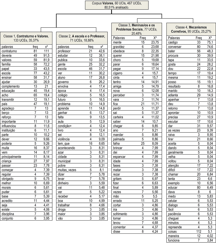 Em síntese, a análise lexicográfica feita a partir dos relatórios do Alceste sugere três focos de RS sobre a construção dos valores morais na relação família, escola e contraturno. Mesmo acreditando na primazia da família na formação dos valores, os pais consideram que o contraturno contribui para a formação moral dos alunos. A escola e os professores são compreendidos em suas precariedades, porém alguns pais ressaltaram que os professores não deveriam se restringir a “transmitir os conteúdos específicos”, uma vez que cabe a eles, também, complementar seu trabalho com “a formação de valores morais”, situação referendada pelos próprios docentes, que também vêem a família como a primeira responsável por essa formação (SANTOS; ROSSO, 2012). A RS de que no ambiente doméstico “educar é corrigir”, com tentativas e escala para a correção do comportamento, constitui o terceiro foco. A referida escala inicia com uma conversa, mas depois se adotam iniciativas de maior impacto, como castigo, tirar algo que a criança e/ou o adolescente gosta, dar um tapa, uma cintada, varada etc., se houver a persistência do mau comportamento.