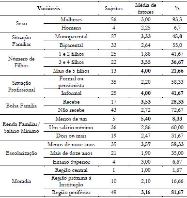 Segundo os indicados critérios, uma família não possui risco presumido; sete famílias possuem um fator; 19 famílias, dois fatores; oito famílias, três fatores; 20 famílias, quatro fatores; duas famílias, cinco fatores; e três famílias apresentam seis fatores dos sete listados. A média geral dos riscos presumidos por família é de 2,95. Pelos dados da tabela 1, que faz o cruzamento entre situação censitária e os riscos presumidos, constata-se que os riscos são maiores em famílias monoparentais que possuem mais de três filhos, têm menos de nove anos de escolarização, apresentam uma situação informal de trabalho que lhes propicia uma renda menor do que um salário mínimo, e vivem nas regiões mais periféricas da cidade.