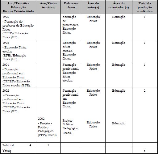 No primeiro período (1996-2002), foi incluída toda a produção acadêmica desde a implantação do PPGE/UEPG, independentemente da Linha de Pesquisa. A primeira dissertação foi finalizada em 1996 e trata da temática sobre a FPEF. Nos anos subsequentes, até 2002, foram concluídas mais quatro pesquisas, sendo: uma sobre a EFE, duas sobre a FPFEF, e uma sobre a temática do Projeto Político Pedagógico (PPP). Assim, a totalidade da produção acadêmica no período de 1996 a 2002 foi de cinco dissertações, sendo os autores todos da área de EF.