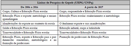Destaca-se que o número (6) de Linhas de Pesquisa do Gepefe permaneceu o mesmo. Entretanto, algumas alterações foram realizadas em relação aos objetivos, sendo também efetivados alguns ajustes em suas denominações. Na linha “Corpo, Cultura e Educação Física escolar”, o termo “cultura” foi excluído, sendo incluso o termo “corporeidade”. Em relação aos objetivos dessa linha, pontua-se especificamente a abordagem sobre questões relacionadas ao corpo e à corporeidade, considerando os aspectos culturais dos diferentes grupos, visando um redimensionamento pedagógico da Educação Física na escola.