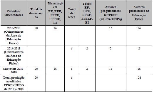 Constata-se a contribuição efetiva do Gepefe na produção acadêmica do PPGE/UEPG, na Linha de Pesquisa de EA, de 2010 a 2018, pois a maioria dos estudos realizados tem como eixo central norteador temáticas relacionadas ao âmbito da EF no contexto escolar e da FP, sendo 16 dissertações e duas teses, totalizando 18 pesquisas, cujos autores são professores de EF. Considerando-se o mesmo período, a totalidade das pesquisas orientadas pelos professores de EF (2) que ingressaram no PPGE/UEPG em 2007, verifica-se que ela é de 26 estudos.