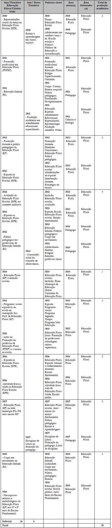 No período de 2003 a 2009, constata-se uma lacuna na produção acadêmica do PPGE/UEPG no âmbito da EF no contexto escolar e da FP, ou seja, não foi realizada nenhuma dissertação cuja pesquisa estivesse relacionada a esses eixos temáticos.