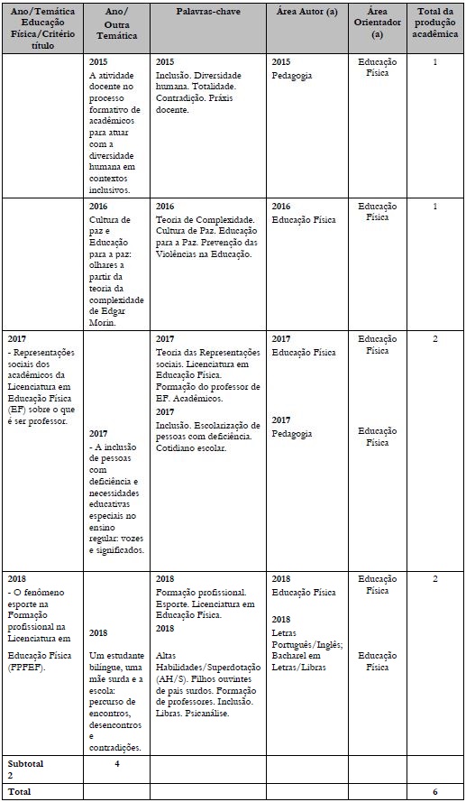 No PPGE/UEPG, na Linha de Pesquisa de EA, de 2015 a 2018, foram concluídas seis teses, sob a orientação dos professores (2) de EF. Duas destas pesquisas têm como temática a FPEF, tendo três teses como autores pesquisadores do Gepefe (UEPG/CNPq). Da totalidade de seis teses, quatro abordam sobre as seguintes temáticas: formação docente para atuar com a diversidade humana em contextos inclusivos (1); cultura de paz e educação para a paz (1); a inclusão no ensino regular vozes e significados (1); um estudante bilíngue, uma mãe surda e a escola (1).