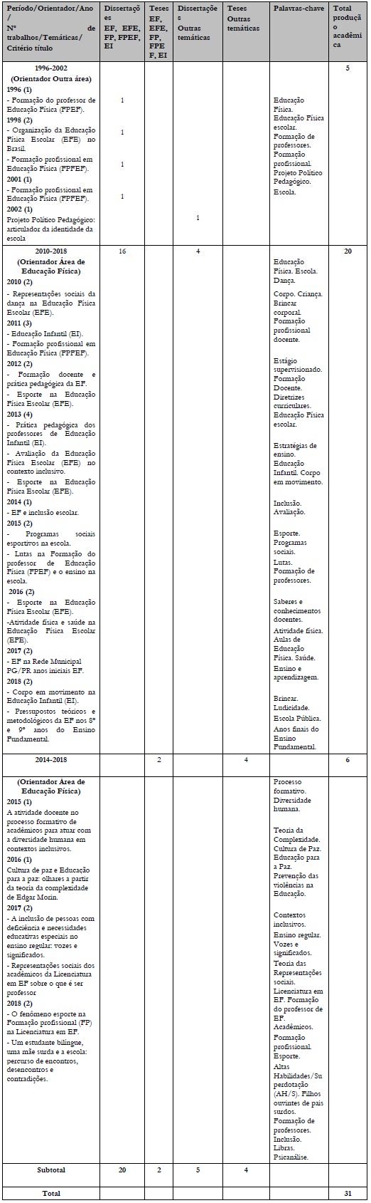 Considerando-se o total da produção acadêmica no PPGE/UEPG, no período de 1996 a 2018, de acordo com os critérios estabelecidos neste estudo, ele é de 25 dissertações e seis teses, totalizando 31 pesquisas, das quais 26 foram orientadas pelos docentes (2) da área de EF que ingressaram no PPGE/UEPG em 2007.