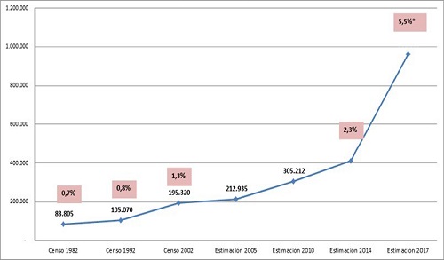 De acuerdo con el último informe del Instituto Nacional de Estadísticas de Chile (INE, 2017) y en concordancia con la información recabada mediante el CENSO respectivo, la cantidad y porcentaje de inmigrantes internacionales, según período de llegada al país, ha aumentado en un 60,2% desde antes de la década de los 90 hasta el período de 2010-2017. En el Censo de 2002, 1,27% de la población residente era inmigrante; 15 años después, el 19 abril de 2017 se censaron 746.465 inmigrantes residentes lo que representa el 4,35% del total de la población residente en el país (con información declarada en lugar de nacimiento).