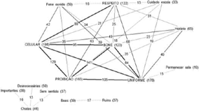 As palavras “celular” e “uniforme” constituem o eixo central com maior frequência de evocações e de coocorrências. Esses elementos são os prováveis termos centrais e organizadores da representação social das regras escolares, uma vez que a palavra “uniforme” possui oito arestas, tendo maior poder associativo que a palavra “celular”, que possui sete arestas. Em seguida, tem-se a palavra “boné” com forte tendência à centralidade, a qual foi evocada 123 vezes e possui oito arestas. Além disso, atentamo-nos para o fato de que os objetos das regras (“celular” – “uniforme” – “boné”) foram os que apresentaram um maior poder organizativo na representação social das regras escolares, o que corrobora os dados evidenciados nas análises anteriores.