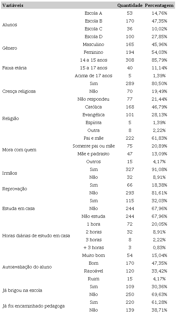 Para a caracterização dos alunos participantes, estão descritas, na Tabela 1, as seguintes variáveis: número de alunos por escola, gênero, idade, se possui crença religiosa, religião, moradia, se possui irmãos, reprovação, hábitos de estudo, autoavaliação e conduta escolar.
