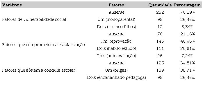 Levando-se em consideração as variáveis utilizadas na caracterização dos alunos, fizemos um agrupamento para análise com o auxílio do software Complex. Para tanto, foram constituídas três variáveis: 1) fatores de vulnerabilidade social; 2) fatores que comprometem a escolarização; e 3) fatores que afetam a conduta escolar. Na primeira, levamos em conta a definição de vulnerabilidade de Janczura (2012), que se aplica a indivíduos que vivem em famílias pobres, com baixo nível socioeconômico, baixa remuneração parental, baixa escolaridade, em famílias numerosas e que têm a ausência de um dos pais. Desse modo, o aluno que tem família monoparental apresenta um fator de vulnerabilidade social, e aquele que possui essa condição aliada ao número de irmãos maior que cinco tem dois fatores.