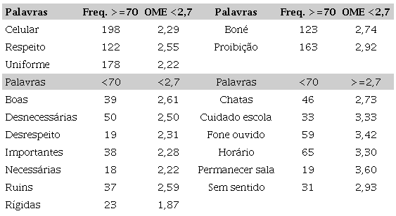 Ao considerarmos como base o conjunto de elementos oriundos da análise do software Evoc, fizemos, a partir das características de cada uma das palavras, o agrupamento dos elementos presentes nos quatro quadrantes, o que possibilitou a construção de seis categorias distintas de evocação: 1) Objetos das regras: celular, uniforme, boné, fone de ouvido, horário; 2) Desdobramento das regras: proibição, cuidado escola, permanecer sala; 3) Atitudes favoráveis: boas, importantes, necessárias; 4) Atitudes desfavoráveis: desnecessárias, ruins, rígidas, chatas, sem sentido; 5) Valores: respeito; e 6) Contravalores: desrespeito.