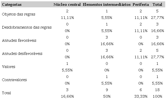 Do total de 18 palavras diferentes que compõem os quatro quadrantes, 16,66% fazem parte do núcleo central, 50% referem-se aos elementos intermediários, e 33,33% compõem a periferia. Os elementos que constituem o núcleo central aparecem em menor número, porém têm uma frequência mais elevada se comparada aos elementos que integram os outros quadrantes.