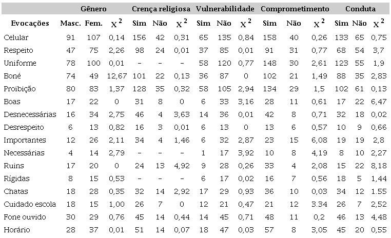 “Boné”, que evidencia um objeto das regras, foi mais citado pelos alunos do gênero masculino. Já a palavra “boas”, que expressa uma atitude positiva frente às regras, teve uma maior contribuição de alunos que não apresentavam fatores que afetam a conduta escolar, que nunca brigaram na escola e que nunca foram encaminhados para a sala da pedagoga. Os alunos que ao representarem as regras escolares como “importantes” são os que apresentam fatores que comprometem a escolarização; aqueles que já reprovaram, não têm hábitos de estudo e se autoavaliam de forma negativa. Ademais, os alunos que consideram as regras “ruins” são os que têm crença religiosa e os que não possuem fatores que afetam a conduta escolar. Esse dado contrapõe-se à ideia de que a crença religiosa auxilia na educação moral na escola. A presença ou a ausência de crença religiosa não contribui, portanto, para a mudança ou a alteração do núcleo central das representações sociais das regras empregadas nas quatro escolas investigadas; dessa forma, é um elemento de natureza geral e constitui-se como um grupo periférico nas representações sociais das regras como qualquer outro subgrupo.