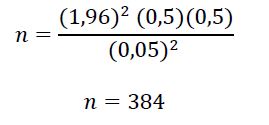 Se utilizó un nivel de confianza de 95%, y se aceptó un margen de error máximo del 5%, siendo Z = 1,96; E 2 = 0.05; p = 0.5; q = 1- 0,5 = 0,5