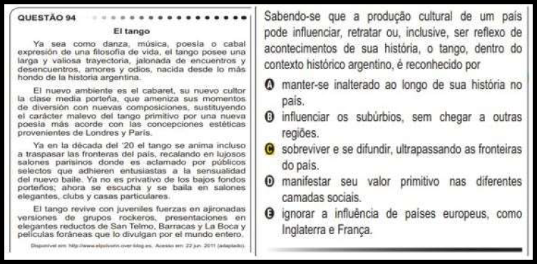 A Questão 94 da prova regular de 2011 traz informações sobre o tango argentino. O texto é adaptado e, embora conste a fonte de onde foi retirado, não encontramos a versão original, portanto os comentários sobre esse item baseiam-se apenas no trecho adaptado para a prova. O texto base apresenta uma descrição clássica do tango, explicando sua gênese no período mais fundo da história Argentina. Na sequência, o texto menciona a difusão do tango pela classe média portenha por meio dos cabarés. Por fim, há um salto temporal, enfatizando seu sucesso musical na Europa e a luxuosidade que passou a envolvê-lo, por volta de 1920.