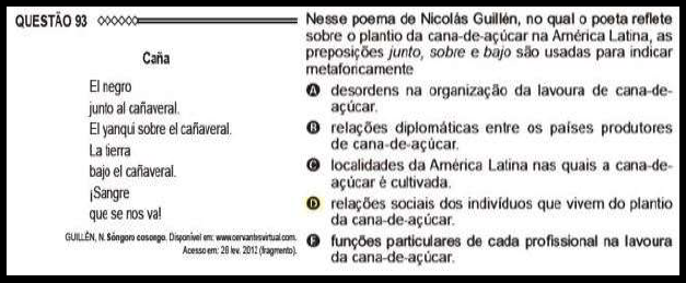 O texto base da Questão 93 da prova de 2015 é um poema do escritor cubano Nicolás Guillén intitulado Caña. Esse poema faz parte do livro Sóngoro Cosongo, publicado em 1931, e que tinha como inspiração a cultura afro-cubana. Nele e em outros livros, Nicolás Guillén reflete os anseios cubanos, evidenciando a afrodescendência a partir de suas particularidades em relação ao povo negro, mas também no âmbito das relações étnico-raciais entre, principalmente, negros e brancos. Como um escritor negro, sua poesia não é isenta, muito menos neutra, e, com maestria, demonstra a vontade de convivência entre as diferentes culturas que compõem Cuba e os conflitos existentes para que essa convivência ocorra de forma respeitosa e justa. Vejamos, na Figura 2, o item elaborado com o poema Caña como texto base:
