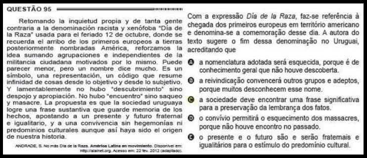 O questionamento da comemoração sobre o dia da raça ganha destaque porque é visto como uma discussão necessária, porém, se seus protagonistas não são evidenciados, mantém-se a exclusão. Evidenciar a atuação dos grupos sociais é uma forma de garantir seu lugar na história e reconhecer a importância da sua participação na sociedade. Manifestações como descrito no texto base do item 95, em relação ao Uruguai, são um exemplo dessas atuações.